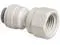 This John Guest adapter fitting is made of acetal copolymer and has tube and flared female NPT connectors. This adapter fitting connects pipes or fittings with different end types, diameters, or materials. It is a push-to-connect fitting that connects to pipes or tubing on one end and has a flared female National Pipe Taper (NPT) connector on the other. The fitting is made of acetal copolymer plastic, which has low moisture absorption, high tensile and flexural strength, and is hard and fatigue resistant. The working pressure for this fitting is up to 150 pounds per square inch (psi). This fitting meets National Sanitation Foundation (NSF)/American National Standards Institute (ANSI) standards 14, 51, and 61 for plastic piping systems, food equipment materials, and use with drinking (potable) water.
