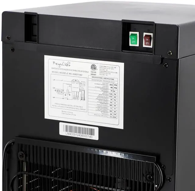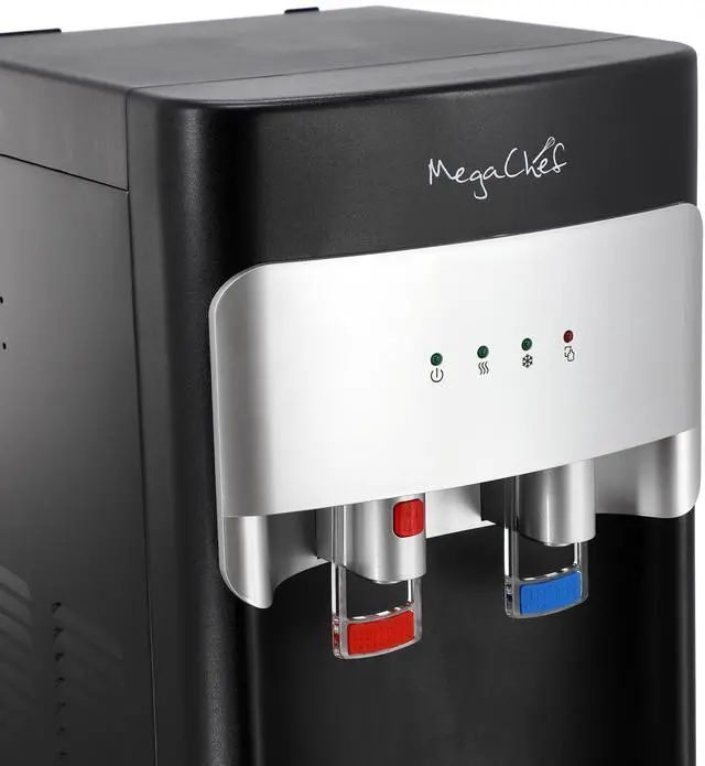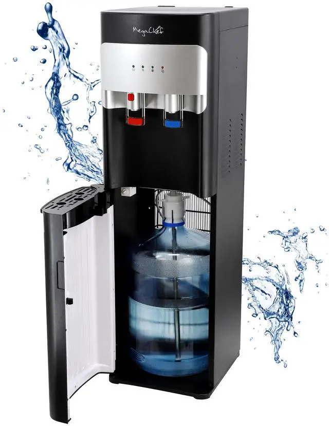 Experience the ultimate in convenience and style with the MegaChef Bottom Load Hot and Cold Water Dispenser in sleek black. Designed to provide effortless access to both hot and cold water, this dispenser is the perfect addition to any home or office setting. Have fresh, clean water at the press of a button with this MegaChef Bottom Load Hot and Cold Water Dispenser. Choose from refreshingly cool water for a quick drink or instant hot water for coffee, tea, or soup. To prevent burns, the hot water tap features a safety lock.