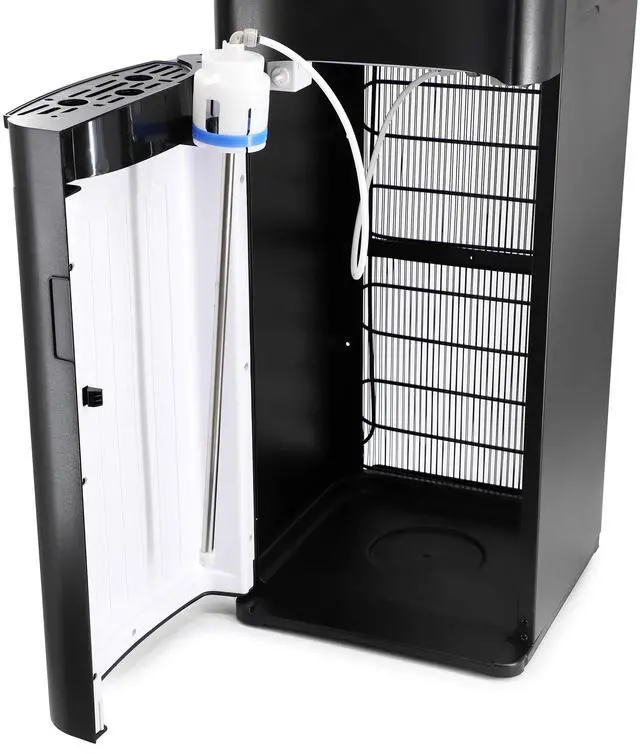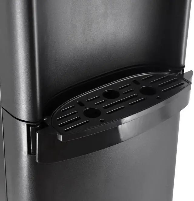 The unit fits standard 3 and 5 gallon bottles and the stainless steel weld tank prevents overheating and water drainage. A removable drip tray catches spills for easy cleanup and can allow room for larger cup sizes if needed. Unlike a traditional top loading water dispenser, this dispenser is loaded from the bottom to prevent strain from lifting and spills making it safer for everyone. A bottle empty indicator light will conveniently let you know when the bottle needs to be replaced.