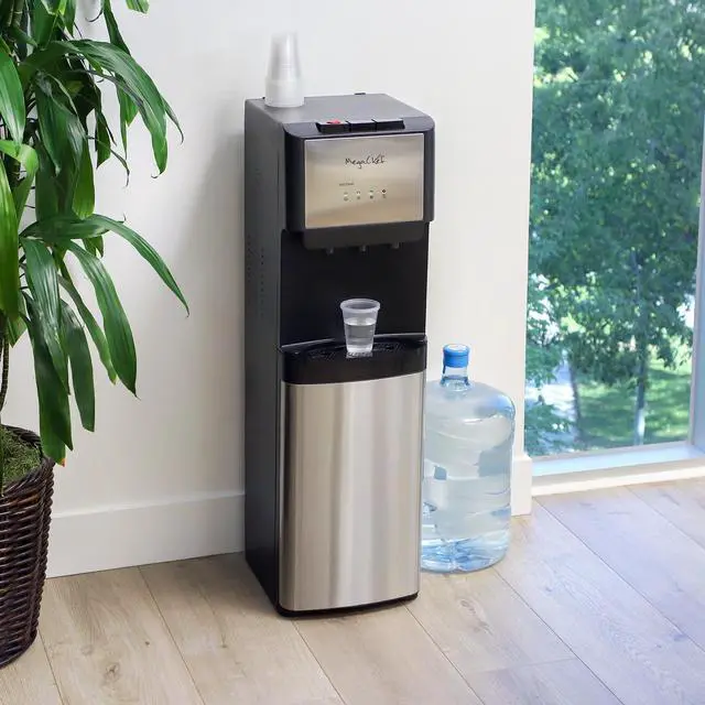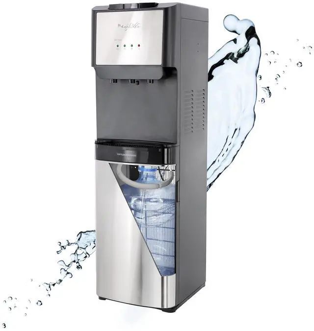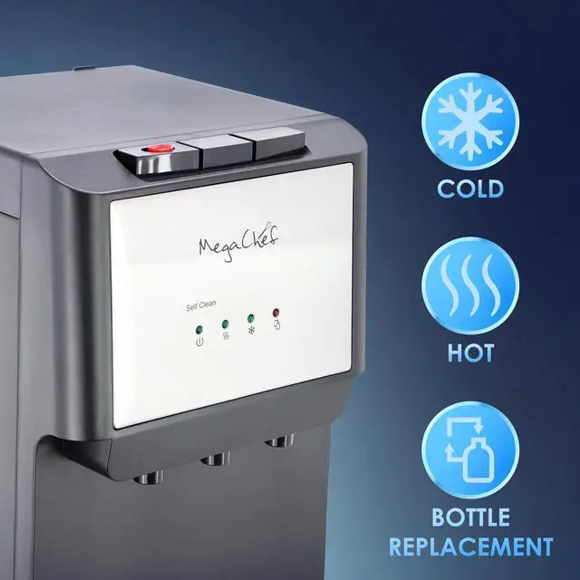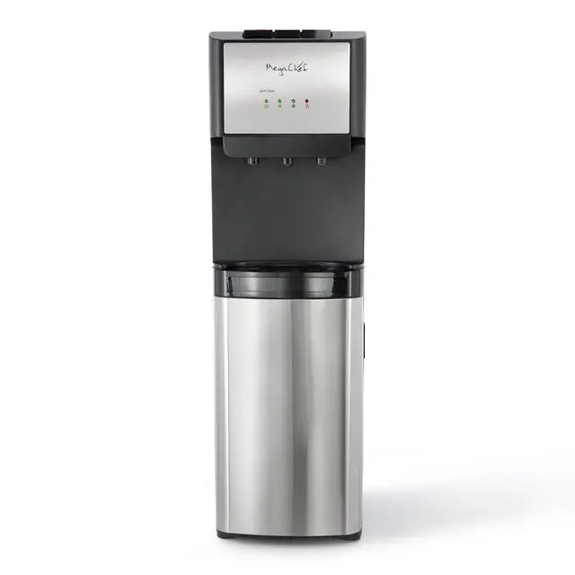 The intuitive control panel features simple push-button operation with indicator lights, making it easy for anyone to use. A built-in child safety lock on the hot water spout adds an extra layer of protection in households with children. With a modern aesthetic that complements any home, kitchen, or office décor, this water dispenser combines powerful performance with energy efficiency to keep water at the perfect temperature while minimizing power consumption. Constructed from durable stainless steel and ABS plastic, and UL certified for quality and safety, the MegaChef 5 Gallon Bottom Load Water Dispenser is an ideal addition to any space where clean, convenient water access is essential.