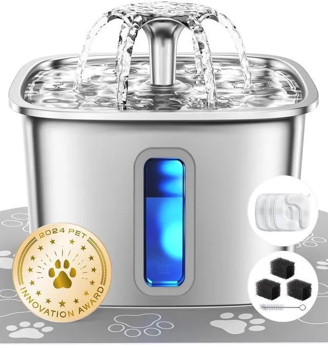 • Premium 304 Stainless Steel & Easy Maintenance. Crafted from high-quality 304 stainless steel, this pet fountain offers a durable, premium build. Its easy to clean all water-contact parts are top-rack dishwasher safe and completely BPA-free. With a generous 108 oz (3.2 L) capacity, it provides plenty of fresh water while reducing the need for frequent refills.