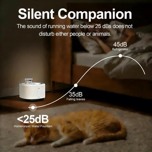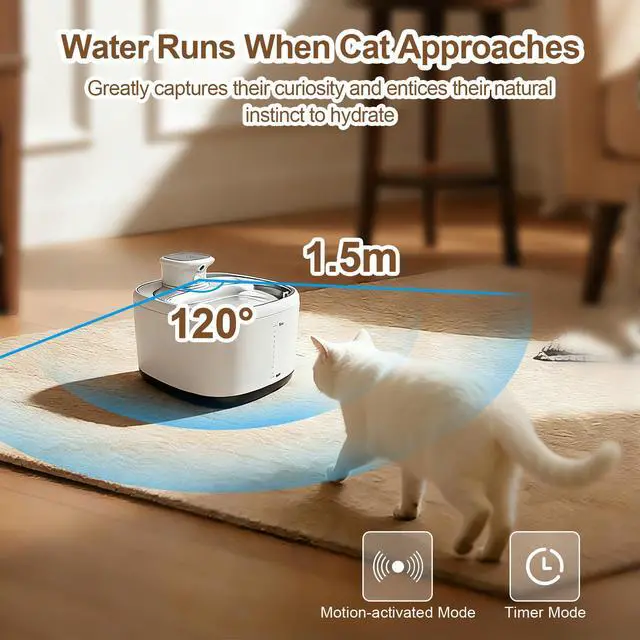 Smart Motion Sensor Cat Water Fountain Encourages Natural Drinking Behavior: This wireless cat water fountain with motion sensor automatically dispenses water when your pet approaches within 1.5m and 120° sensing range, stimulating curiosity and encouraging cats and small dogs to drink more frequently. Unlike traditional pet water bowls or gravity water dispensers, the flowing water design helps promote healthy hydration habits and supports kidney and urinary health for indoor pets