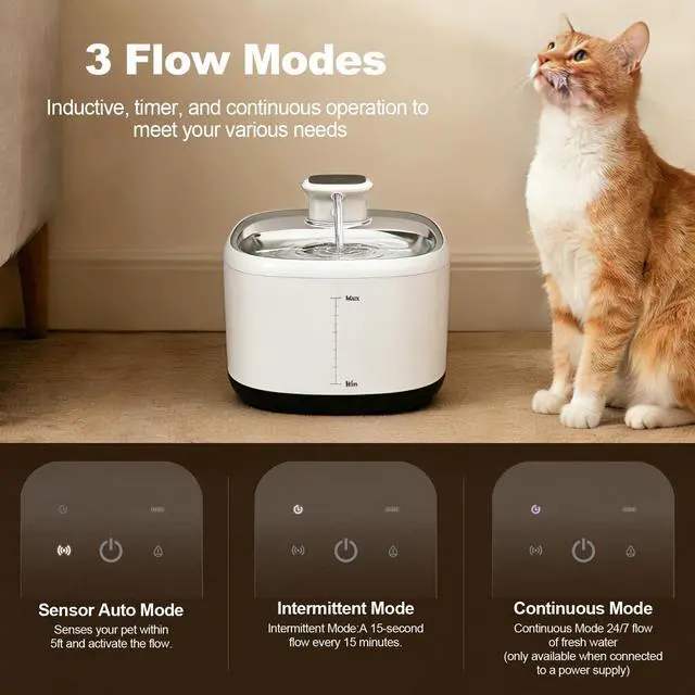 3 Working Modes Sensor, Timed & Continuous Flow for All-Day Use: This automatic pet water fountain features three intelligent modes to match different needs: Sensor Mode for energy-saving operation, Timed Mode (every 10 minutes for 15 seconds) for consistent hydration, and Continuous Flow Mode when plugged in for constant circulation. Ideal for busy pet owners, workdays, short trips, or overnight use, making it a reliable cat water dispenser automatic solution