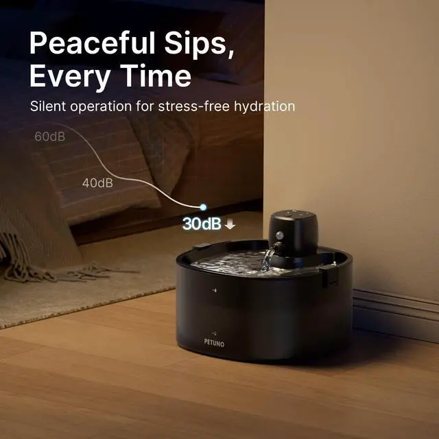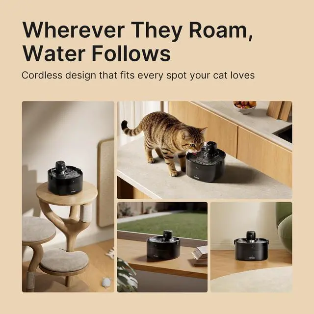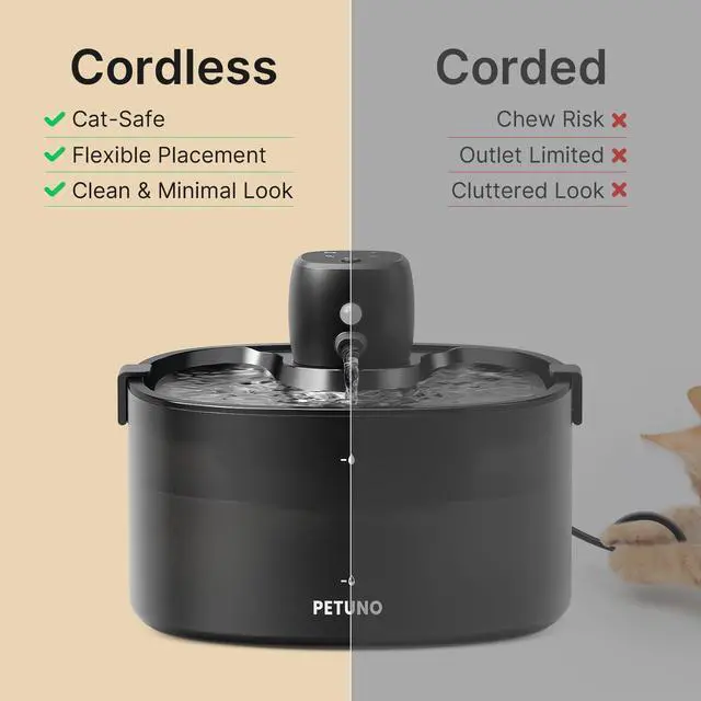 • Placement Freedom & Total Safety Stop searching for open outlets or worrying about messy cords. Our cordless cat water fountain gives you the freedom to set up a fresh water spot in any corner of your home from the living room to a quiet hallway. Since there are no power cables, you wont have to worry about curious kittens chewing on wires. This battery-operated cat fountain is the easiest way to keep your floors clutter-free and your pets safe.