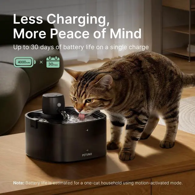 • 30-Day Battery & Hassle-Free Charging Forget about daily charging. This rechargeable cat fountain lasts up to 30 days on a single charge, so your pet stays hydrated even when youre away for the weekend. The battery is detachable, meaning you can just pop it out to recharge without having to lug the entire unit to a wall outlet. Grab a spare battery to swap in for a battery-operated pet fountain that runs 24/7. Its a simple, reliable setup that actually fits your busy schedule.