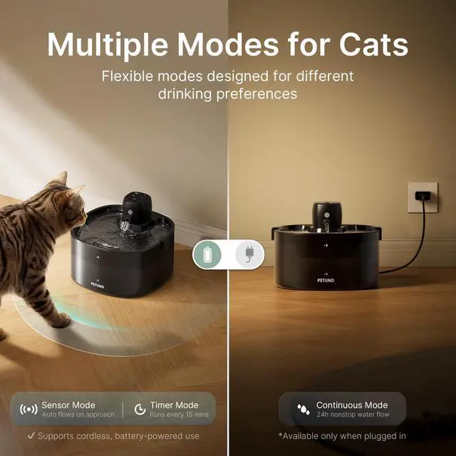 • 3 Modes to Match Your Cats Personality Choose between three settings to find what works best for your pet. The Sensor Mode triggers a fresh flow whenever they get close, which is great for piquing their curiosity and encouraging them to drink. You can switch to Timed Mode to help set a regular drinking routine, or plug it in for a continuous stream to help shy cats get comfortable. Its a versatile motion-sensor cat fountain designed for any indoor cat water fountain setup.