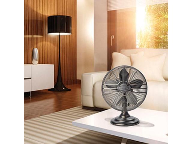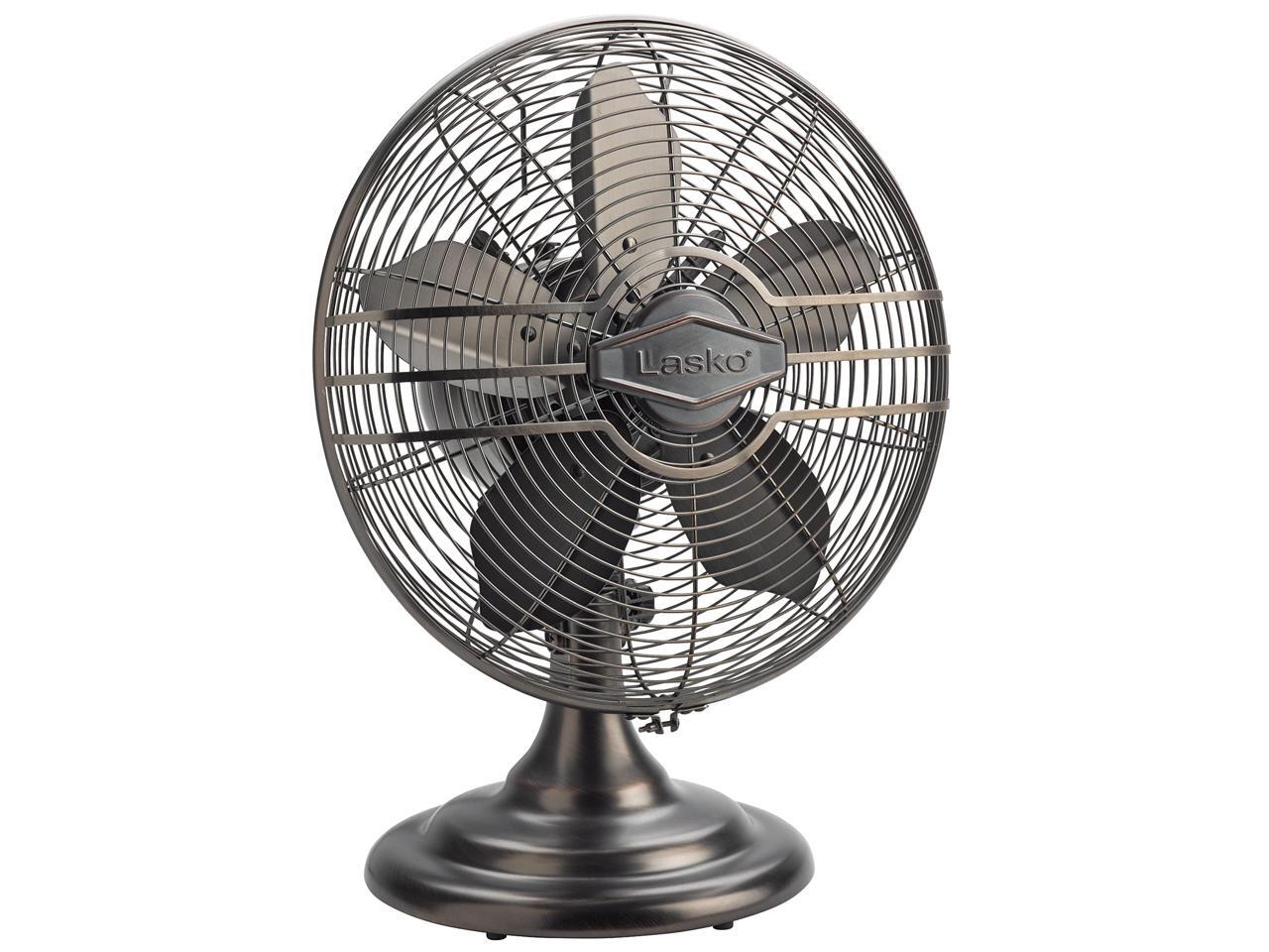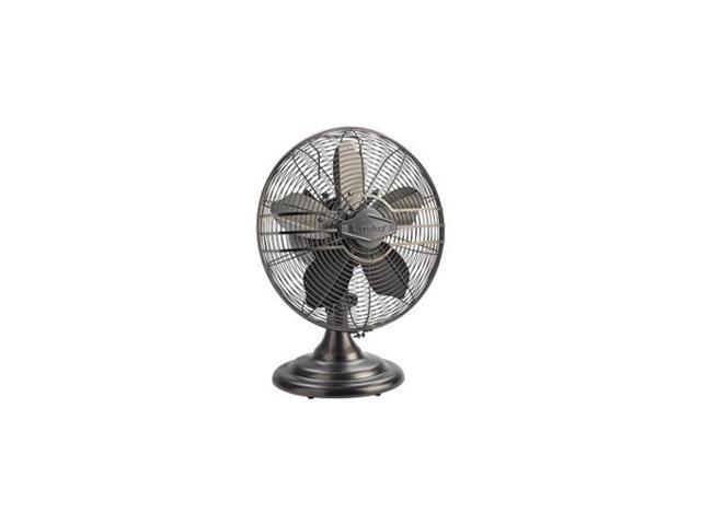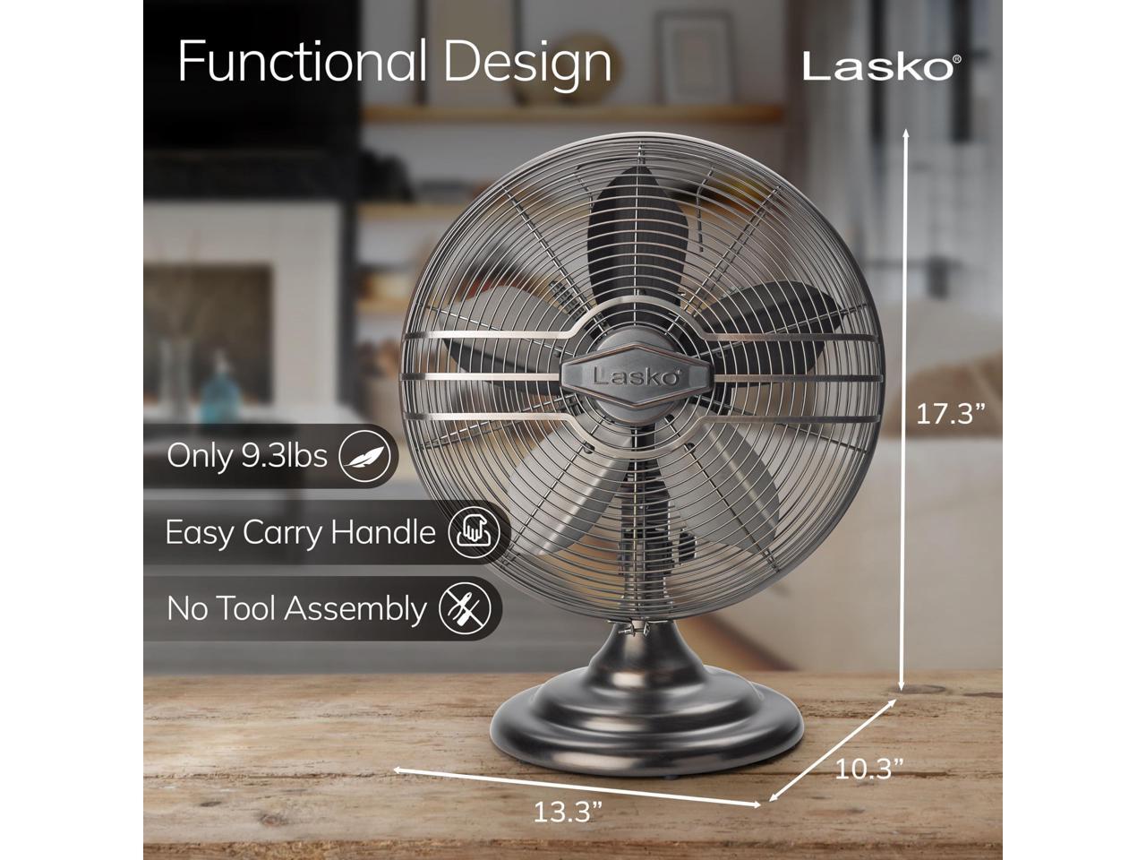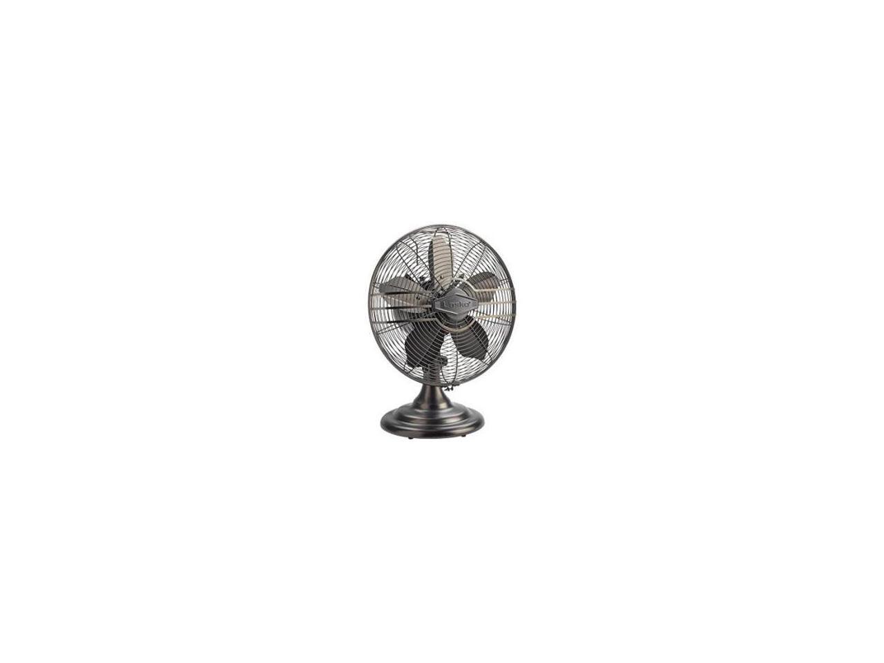 • ll-metal, vintage design - A beautiful, retro-style table fan (at 17.25" x 13.25" x 10.25") that fits perfectly on your desk at work, a bedside table, or on a countertop; Weighs 9.32 lbs, so it feels sturdy and durable High quality construction - Outer body is made of all metal with a gorgeous oil-rubbed bronze finish; Includes a built-in carry handle.
