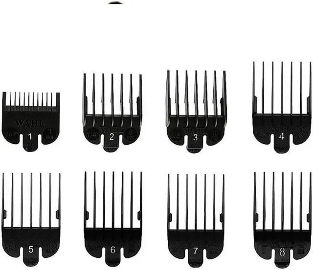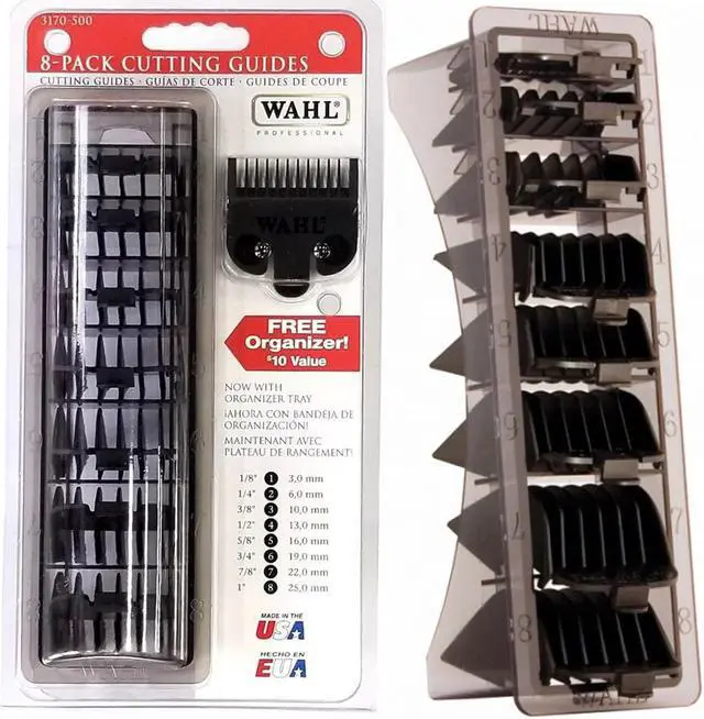 Wahl 8 Pack Cutting Guides with Organizer - Black #3170-500 Create your desired look with ease with the Wahl Black Cutting Guides. Each cutting guide is designed to glide through hair quickly and efficiently for a smooth, time saving finish that both you and your client will appreciate. For your convenience, you get 8 combs ranging from 1/8 to 1 for a full variety of options with seamless accuracy. The Black Cutting Guides include 8 cutting guides and an organizer tray to keep your station neat and transportation easy. Fits all full size series blades except for competition series and 5-in-1 Magic blades.