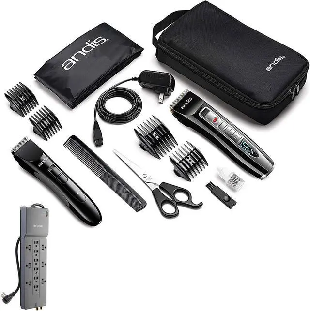 Cord / cordless adjustable blade clipper features a lithium-ion battery for over 4 hours of use and digital LCD display for 5-speed control. Adjustable titanium and ceramic clipper blades for long life and ultimate cutting versatility. Cord / cordless trimmer features a lithium-ion battery for 90 mintues of use. Fine-cutting stainless-steel trimmer blade easily trims beards moustaches and sideburns. 13-Piece combo kit includes: Cord / cordless clipper 2 Reversible clipper attachment combs (3mm / 6mm 9mm / 12mm) 2 Reversible trimmer attachment combs (2mm / 3mm 4mm / 5mm) Storage case Blade brush Clipper and trimmer charging adaptor Scissors Cape Barber comb Blade oil.