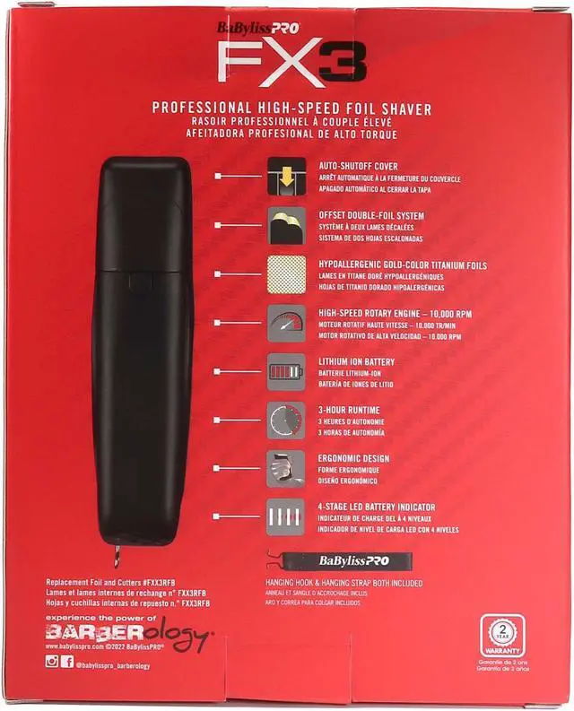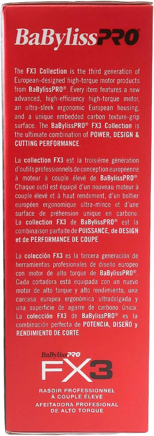 BaByliss Pro FX3 Professional High-Speed Foil Shaver - Black #FXX3SB (Dual Voltage)The FX3 Collection is the 3rd generation of European design, High Torque Brushless motor products from BaBylissPRO. Every item features advanced high-torque brushless engines, ultra-sleek ergonomic European housings, and a unique embedded carbon texture grip surface.