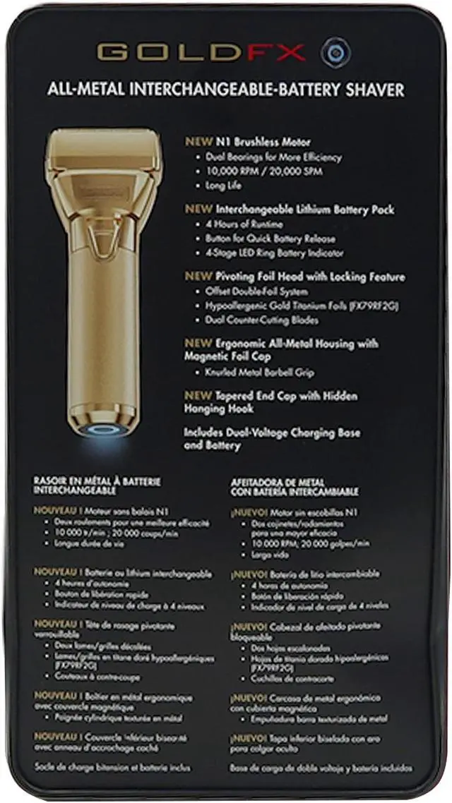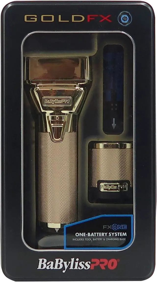 BaByliss Pro FXONE GOLDFX All-Metal Interchangeable-Battery Shaver #FX79FSGIntroducing The FXONE Collection! One Battery. Unlimited Tools. The new FXONE system is a one-battery system compatible with all FXONE tools. Includes Tool, Battery & Charging Base.