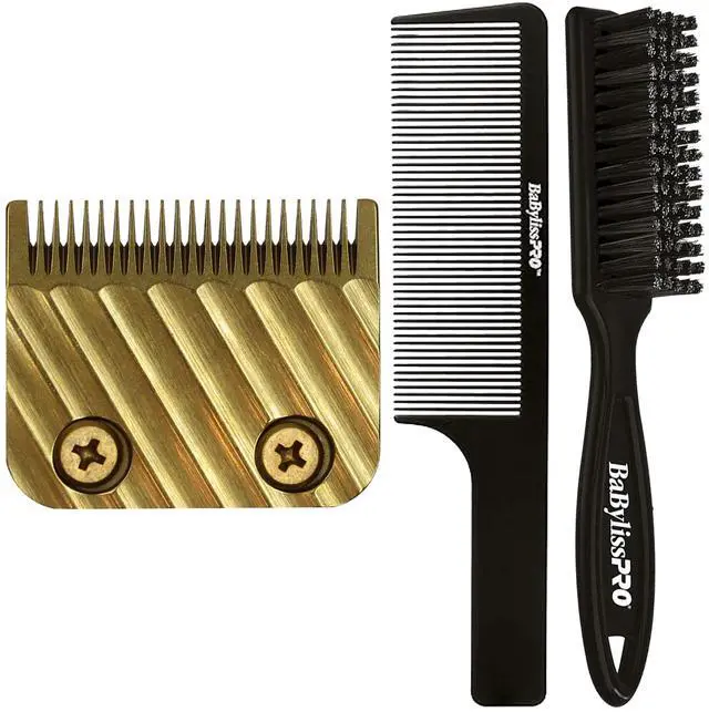 BABYLISS PRO REPLACEMENT GOLD TITANIUM WEDGE BLADE #FX603G + FADE BRUSH BPFADEB + 9" CLIPPER COMB BaByliss Pro Replacement Gold Titanium Wedge Blade #FX603GStep up your grooming game with the Gold Wedge Replacement Blade. This blade is meticulously crafted to act as a fade and tape blade that will enhance your styling skills, delivering precise and clean cuts. Its unique wedge shape is perfect for various styling techniques. Whether you're creating fades or detailed designs, this blade consistently delivers exceptional results. The stunning gold finish adds a touch of luxury to your grooming tools. With low-friction properties, it ensures a smooth and comfortable styling experience. Compatible with various two-hole blade systems, including the BaByliss PRO GOLDFX Clipper.