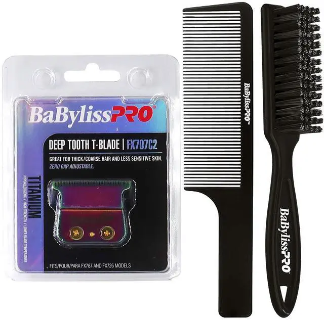 BABYLISS PRO CHAMELEONFX REPLACEMENT TITANIUM DEEP TOOTH T-BLADE #FX707C2 + FADE BRUSH BPFADEB + 9" CLIPPER COMBBaByliss Pro Replacement Titanium Deep Tooth T-Blade #FX707C2The BaByliss Pro T-Blade is a deep tooth T-Blade and fits all FX787 and FX726 models.