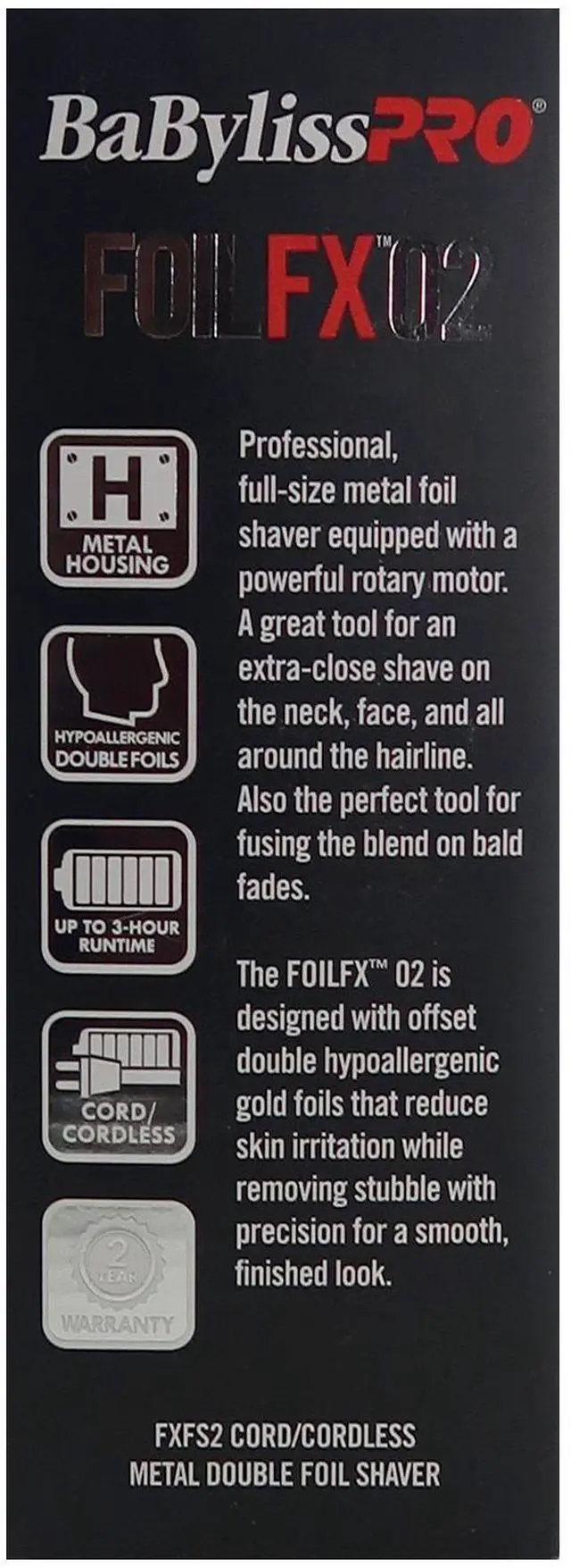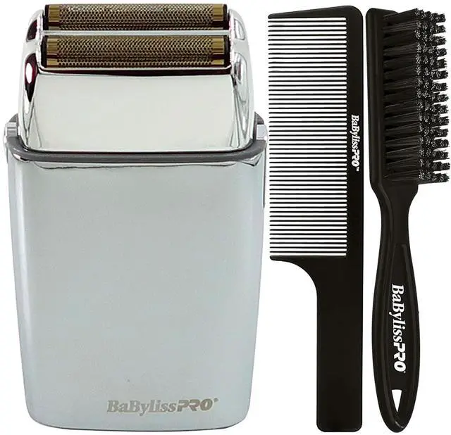 BABYLISS PRO FOILFX02 CORDLESS METAL SILVER DOUBLE FOIL SHAVER FXFS2S-SILVER + FADE BRUSH BPFADEB + 9" CLIPPER COMBBaByliss PRO FOILFX02 Cordless Metal SILVER Double Foil Shaver FXFS2S-SILVERFOILFX02 Cordless Metal Double Foil Shaver is full-size metal foil shaver equipped with a powerful rotary motor. A great tool for an extra-close shave on the neck, face, & all around the hairline.