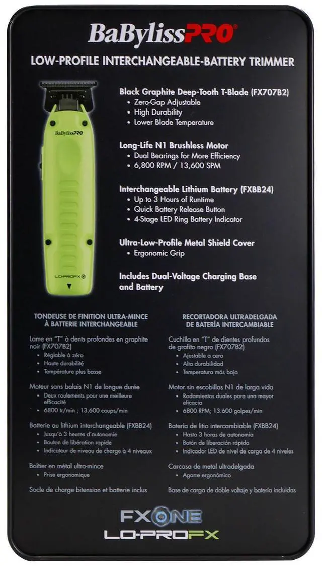 BaBylissPRO® FXONE Lo-ProFX Limited Edition Neon Yellow Trimmer (Kit Includes Charging Base & Battery) Designed with advanced N1 brushless motors, both the clipper and trimmer deliver exceptional cutting performance, high efficiency, and long-lasting durability.