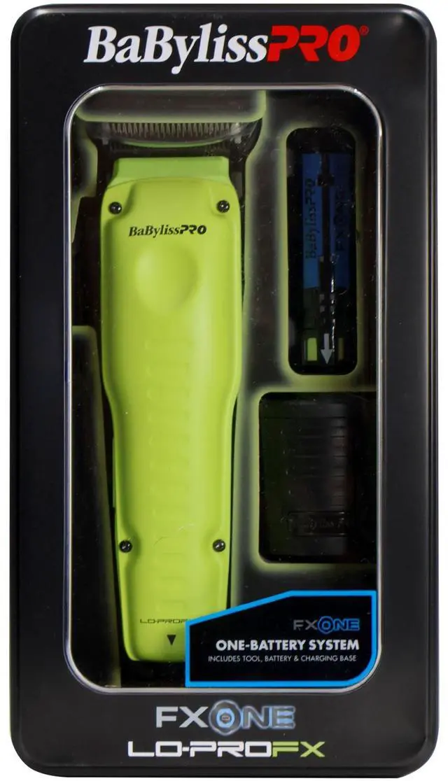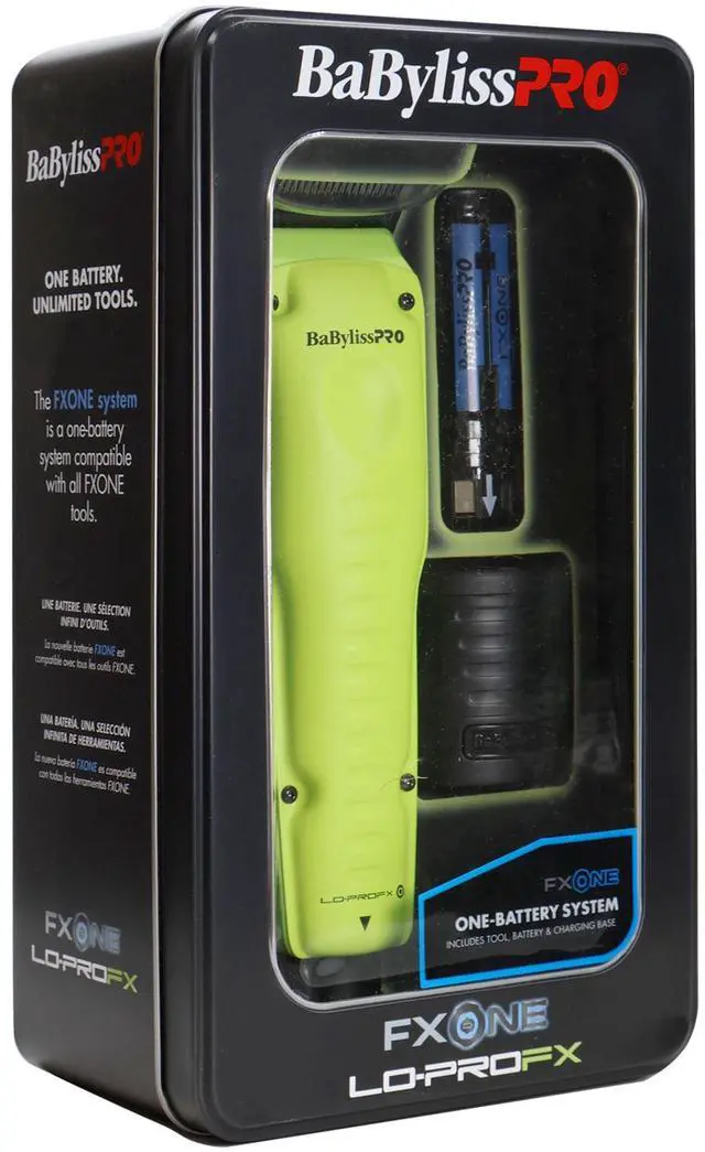 BaBylissPRO® FXONE Lo-ProFX Limited Edition Neon Yellow Clipper (Kit Includes Charging Base & Battery) Designed with advanced N1 brushless motors, both the clipper and trimmer deliver exceptional cutting performance, high efficiency, and long-lasting durability.