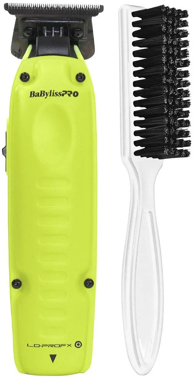 BABYLISSPRO FXONE LO-PROFX LIMITED EDITION NEON YELLOW TRIMMER WITH CHARGING BASE & BATTERY - FX729NY + BABYLISS PRO FADE BRUSH - WHITE BaByliss PRO FXONE Lo-ProFX Limited Edition Neon Yellow Trimmer Designed with advanced N1 brushless motors, both the clipper and trimmer deliver exceptional cutting performance, high efficiency, and long-lasting durability.