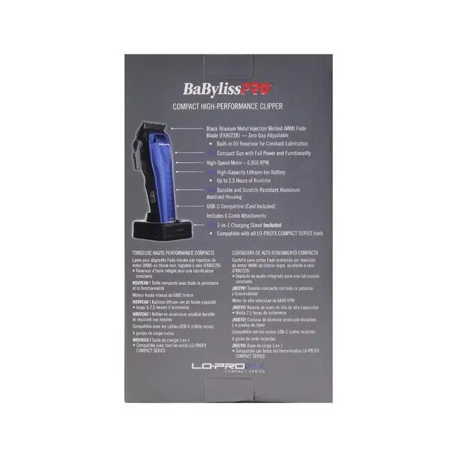 BABYLISSPRO FXONE LO-PROFX HIGH PERFORMANCE COMPACT CLIPPER (FX82) + BABYLISSPRO BARBEROLOGY 9 INCH CLIPPER COMB BaBylissPRO® LO-PROFX Compact Series Clipper The LO-PROFX COMPACT SERIES Compact High-Performance Clipper features an ultra-low profile metal shield cover and ergonomic grip housing. Its powered by a high-speed DC motor 6,800RPM, with a high-capacity lithium-ion battery. It is made with durable and scratch-resistant aluminum anodized housing.