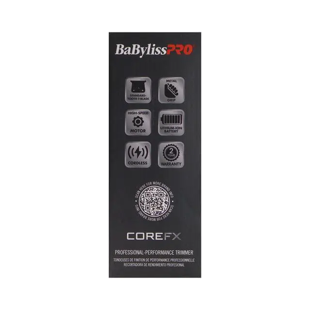 BABYLISSPRO COREFX PROFESSIONAL PERFORMANCE HAIR TRIMMER - FX76 + BABYLISS PRO FADE BRUSH BaBylissPRO® COREFX Trimmer The COREFX Trimmer gives you the power to create clean lines and sharp details, whether youre shaping a beard or finishing a line-up. Its high-speed motor and durable, stainless-steel T-blade deliver precise trimming every time, while the lightweight, cordless design makes it comfortable to handle for long grooming sessions. The COREFX trimmer provides consistent professional power and performance both behind the chair and at home.