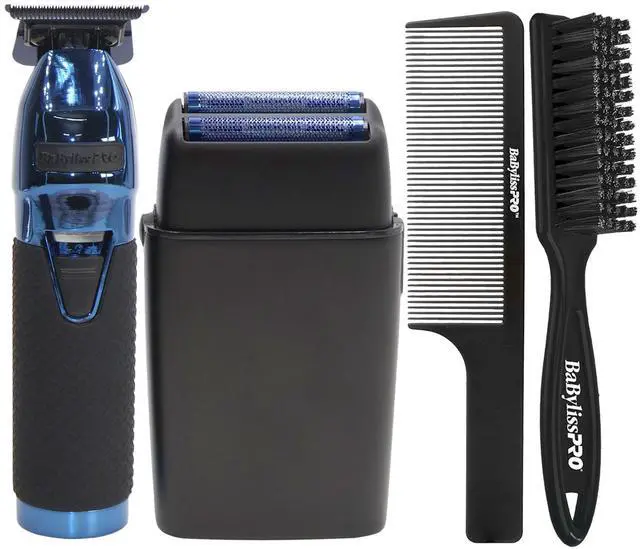 BABYLISS PRO LIMITEDFX COLLECTION LIMITED EDITION TRIMMER AND DOUBLE FOIL SHAVER BLUE #FXDUOFS2TBL + BABYLISS PRO FADE BRUSH + 9" CLIPPER COMB