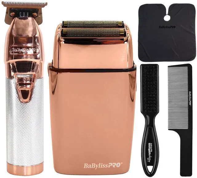 BABYLISS PRO LIMITEDFX COLLECTION LIMITED EDITION TRIMMER AND DOUBLE FOIL SHAVER ROSE GOLD #FXDUOFS2TRG + FADE BRUSH BPFADEB + 9 INCH CLIPPER COMB + PROFESSIONAL CUTTING CAPE