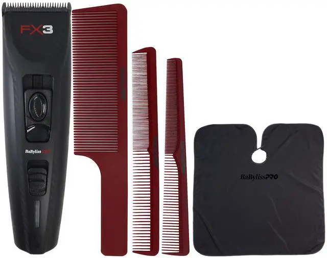 BABYLISS PRO FX3 BLACK HIGH TORQUE CORDLESS CLIPPER FXX3CB (BLACK) + BABYLISS PRO BARBEROLOGY COMB SET (CLIPPER, CUTTING, TAPER COMBS) + BABYLISS PRO BARBEROLOGY PROFESSIONAL CUTTING CAPE BBCAPEMBBaByliss PRO FX3 Black High Torque Cordless ClipperThe FX3 Collection. Every item features advanced high-torque engines, ultra-sleek ergonomic European housings, and a unique embedded carbon texture grip surface. The BaByliss Pro FX3 Collection is the ultimate combination of