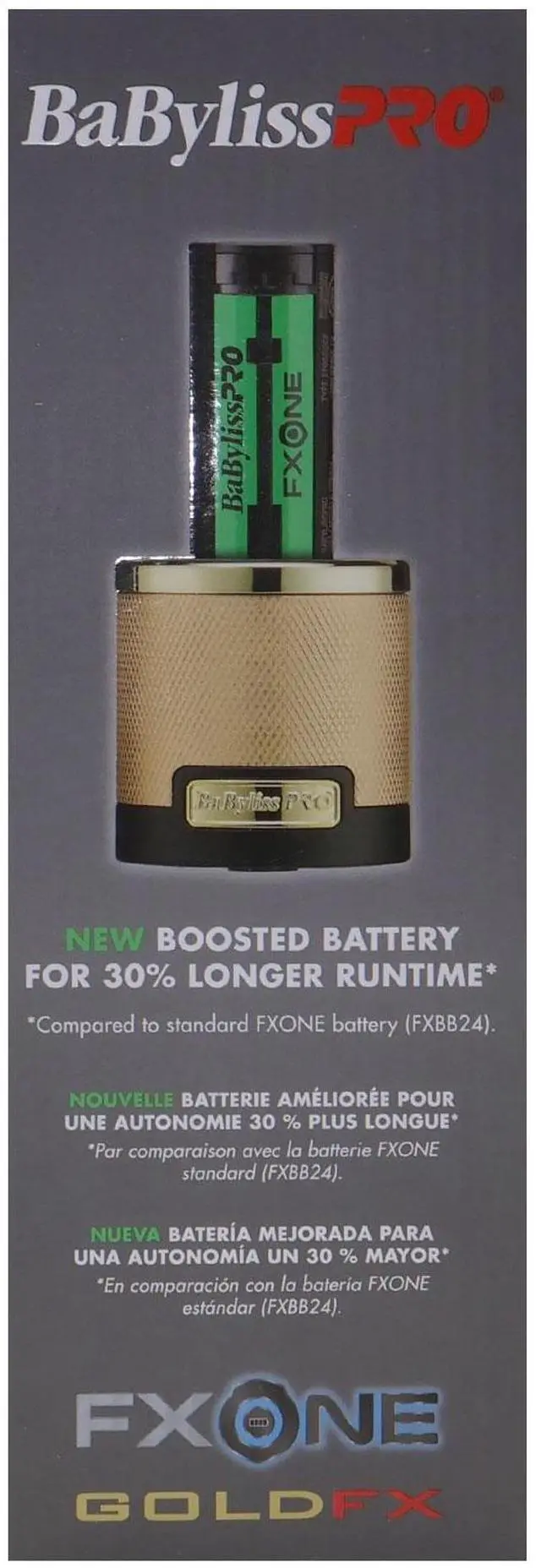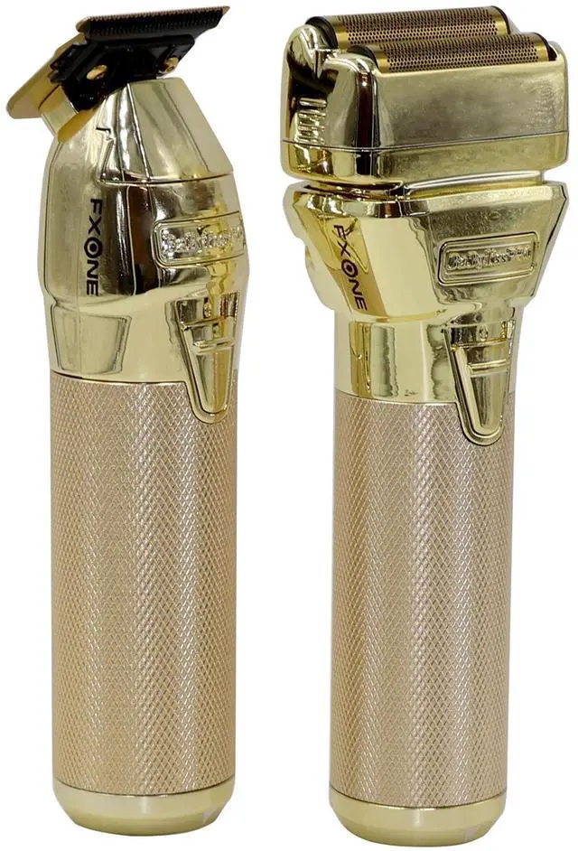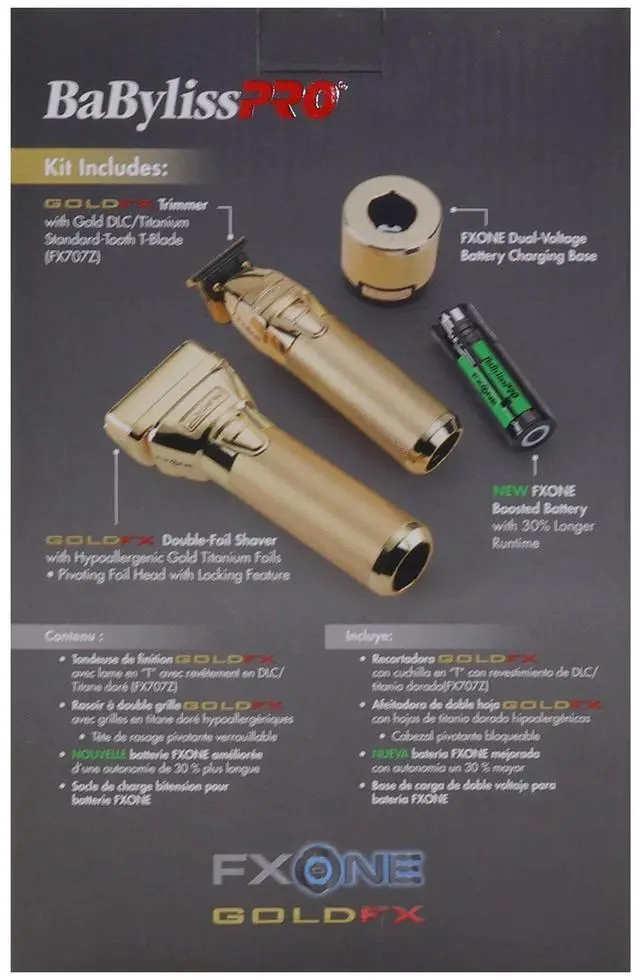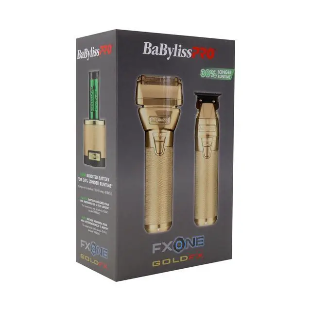 BABYLISS PRO FXONE GOLDFX LIMITED EDITION PREPACK - OUTLINING TRIMMER AND DOUBLE FOIL STICK SHAVER (GOLD) FX1FSTGPK WITH FXONE DUAL-CHARGING PREPACK FXC2BPPK AND COMBBaByliss Pro FXONE GOLDFX Limited Edition Prepack (Gold) FX1FSTGPK Elevate your grooming routine with the FXONE GoldFX All-Metal Shaver & Trimmer Prepack, a limited edition professional-grade set that combines sleek design with exceptional performance. Crafted with durable all-metal construction and finished in striking GoldFX accents, this premium grooming kit includes a precision Gold DLC/Titanium standard-tooth T-blade trimmer and a double-foil shaver featuring hypoallergenic gold titanium foils that deliver a close, smooth, irritation-free finish. The pivoting foil head with locking mechanism adapts effortlessly to facial contours for consistent results, while the dual-voltage charging base and boosted FXONE battery provide global compatibility and up to 30% longer runtime, making this set ideal for barbers, stylists, and grooming enthusiasts alike.