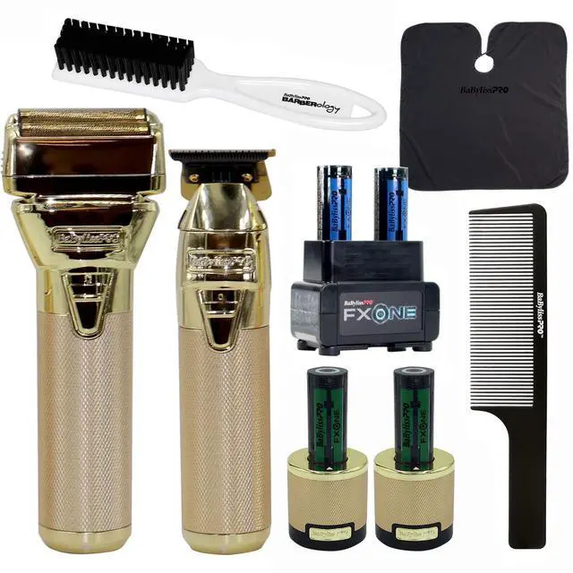 BABYLISS PRO FXONE GOLDFX LIMITED EDITION PREPACK - OUTLINING TRIMMER AND DOUBLE FOIL STICK SHAVER (GOLD) FX1FSTGPK PRO BARBER KITBaByliss Pro FXONE GOLDFX Limited Edition Prepack (Gold) FX1FSTGPKElevate your grooming routine with the FXONE GoldFX All-Metal Shaver & Trimmer Prepack, a limited edition professional-grade set that combines sleek design with exceptional performance. Crafted with durable all-metal construction and finished in striking GoldFX accents, this premium grooming kit includes a precision Gold DLC/Titanium standard-tooth T-blade trimmer and a double-foil shaver featuring hypoallergenic gold titanium foils that deliver a close, smooth, irritation-free finish. The pivoting foil head with locking mechanism adapts effortlessly to facial contours for consistent results, while the dual-voltage charging base and boosted FXONE battery provide global compatibility and up to 30% longer runtime, making this set ideal for barbers, stylists, and grooming enthusiasts alike.