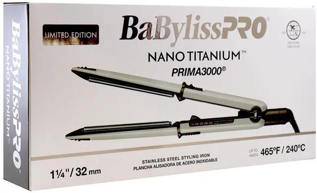 BaByliss Pro Limited Edition Nano Titanium Prima 3000 Stainless Steel Flat Iron Grey - 1-1/4" #BNT3000TGY (Dual Voltage) The BaBylissPRO® Nano Titanium Prima® Styling Irons take the very idea of a straightening iron to unprecedented heights. Crafted from the most advanced materials. Designed with cutting-edge features that redefine ease of use and excellence of performance. This is the ultimate achievement in styling tools.