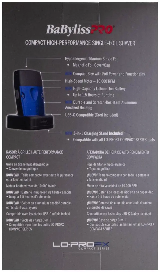 BaByliss PRO Lo-ProFX Compact Blue Single Foil Cordless Shaver A great tool for an extra-close shave on the most detailed areas of the neck, face and all around the hairline. The LO-PROFX COMPACT SERIES Compact High-Performance Single-Foil Shaver is powered by a high-speed DC motor, 10,000 RPM, with a high-capacity lithium-ion battery. It is equipped with a single hypoallergenic black titanium foil that helps to reduce skin irritation and removes stubble with precision for a smooth, finished look. It is made with durable and scratch-resistant aluminum anodized housing.