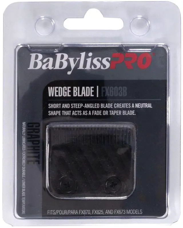 BaByliss Pro Black Graphite Wedge Clipper Blade The Black Graphite Wedge Blade is a cutting-edge tool designed to elevate your styling game. This wedge blade is engineered for precision cutting, enabling you to create ultra-precise and clean cuts with ease. The blade's unique wedge shape allows for versatility in styling, making it perfect for both vertical and horizontal cutting motions. Whether you're working on fades or intricate designs, this blade delivers exceptional results. It boasts ultra-low friction for seamless styling, ensuring a smooth and comfortable experience for your clients. Compatible with all two-hole blade systems, including the BaBylissPRO SilverFX+ All-Metal Lithium Clipper