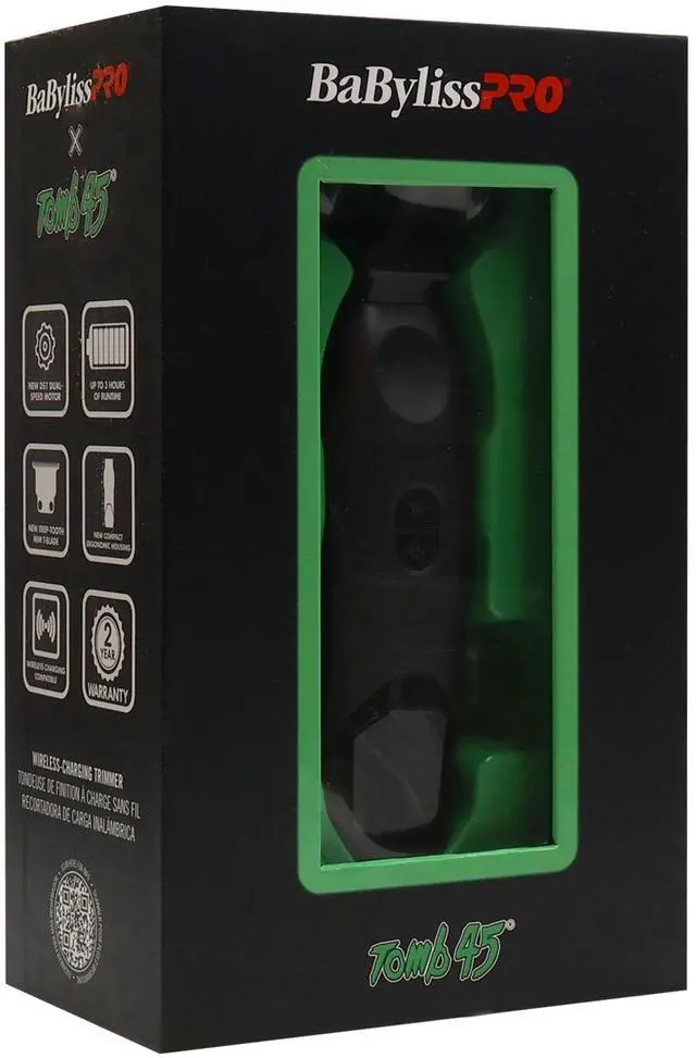 The BaBylissPRO x Tomb45 Trimmer is built for precision and power, designed by barbers, for barbers. It features a Deep-Tooth MIM T-Blade with lower blade temperature, a built-in oil reservoir, and zero-gap adjustability. Powered by the DS1 Dual-Speed Motor and a high-capacity lithium-ion battery, it delivers up to 3 hours of runtime. With a reversed blade orientation for crisp line-ups, wireless charging compatibility, and USB-C charging, its crafted for pro-level performance.