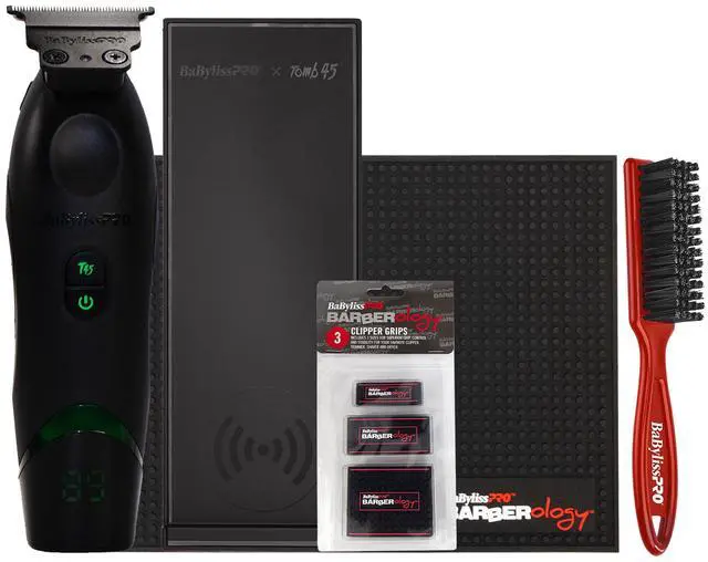 BABYLISSPRO X TOMB45 WIRELESS-CHARGING HAIR TRIMMER FOR MEN + BABYLISS PRO X TOMB45 CLIPPER / TRIMMER WIRELESS CHARGING MAT #FXT45MAT + BABYLISS PRO BARBEROLOGY CLIPPER GRIPS - 3 PACK BBCKT8-PK + PROFESSIONAL BARBER MAT + FADE BRUSH BPFADEBR BaByliss Pro x Tomb45 Wireless-Charging Hair Trimmer for Men The BaBylissPRO x Tomb45 Trimmer is built for precision and power, designed by barbers, for barbers. It features a Deep-Tooth MIM T-Blade with lower blade temperature, a built-in oil reservoir, and zero-gap adjustability. Powered by the DS1 Dual-Speed Motor and a high-capacity lithium-ion battery, it delivers up to 3 hours of runtime. With a reversed blade orientation for crisp line-ups, wireless charging compatibility, and USB-C charging, its crafted for pro-level performance.