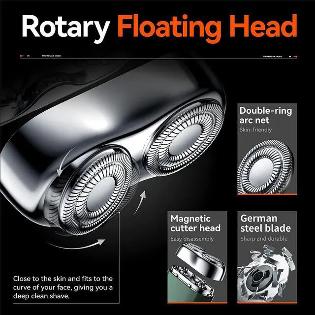 Gentle & Close Shave yoose rotary shaver features a double ring arc shaving head. The round shaving head whose cambered blade units ensure gentle, yet precise operation. Skin-friendly shaving without irritation. Floating design, shaving close to the face. German steel automatic grinding blade, always keep sharp. Enjoy a comfortable, clean shave.