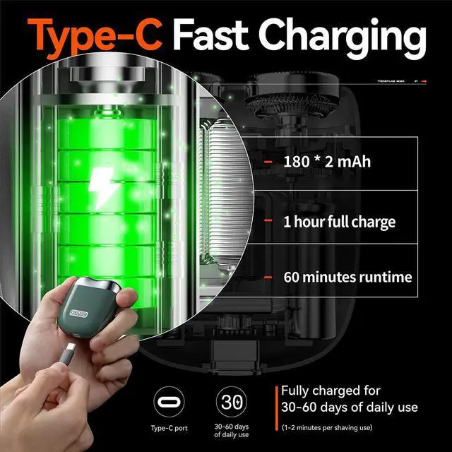 Big Power in Small Size The yoose mini portable electric shaver is powered by a USB-C rechargable lithium battery. A quick 1 hour full charge provides 60 minutes run time, enough for 30 days of daily use. This electric razor is equipped with a 7200 rpm high-speed silent motor which can efficiently complete the shaving task and reduce repetitive work, making shaving easy.