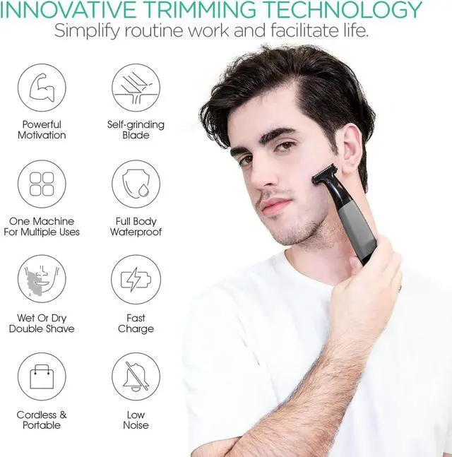 • Precision shaving and ultimate closeness - Beard trimmer has stainless steel Self-Sharpening double-sided blade, ensure the sharpness and durability of the blade. Curved blade serration design angle, which reduces friction on the skin, and have precise gaps to achieve one pass even trimmer.