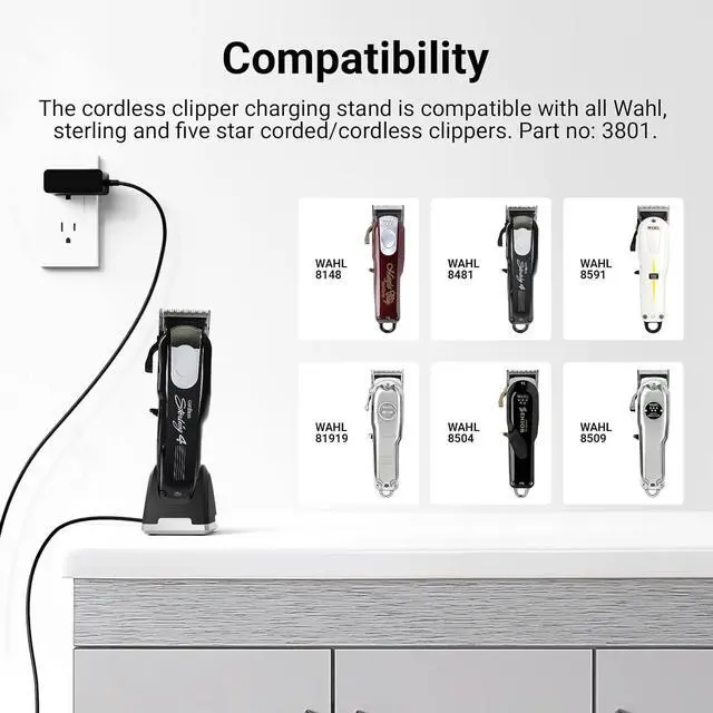 Perfectly CompatibleThe cordless clipper charging stand is compatible with all Wahl, Sterling and Five Star corded/cordless clippers.