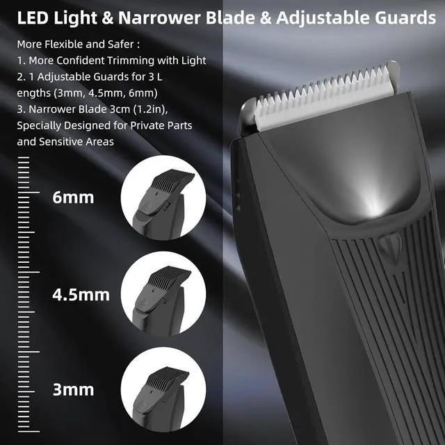 Men: Experience the ultimate in safety, comfort, and performance with INVJOY Pubic Hair Trimmer for men. With its anti-cut safe soft ceramic blades, powerful motor that operates at 7000 RPM, and Lighting to help you see what you' re doing, perfect for use on sensitive areas like below-the-waist, scrotum area, buttocks, groin, and underarms. Always begin with using the protection trimmer comb to trim the sensitive areas, ensuring optimal safety and comfort.