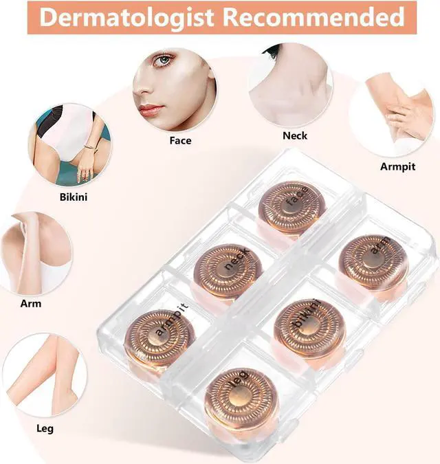 Compartments Storage Box Ach order contains 6 hypoallergenic replacement heads refill and 2 cleaning brush. Replacement heads for finishing touch are packed in a compartmentalized storage box with cover in order to keep the items from dust, dirty as the new gold standard of beauty product refill. Keep the items are tidy and clean to your hands. The brand bag delivered can be used to carry the hair remover to protect the shell. Also be used to store replacement heads, brush and data cables.