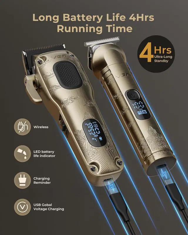 Long Battery Life for All-day Use, Cordless and Rechargeable - Powerful battery was built in the VGR mens clippers and grooming set can run up to 240 minutes for multiple cuts on a single charge. Wireless design makes it easy to use. USB charging with universal voltage support.