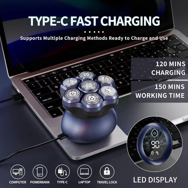 LED Display and type-c fast charging bald head shaver show the percentage of the battery power. Low battery and water washing reminder. Press the switch button for 3 seconds to open travel lock to avoid additional power consumption. Up to 90 minutes of use on a single charge