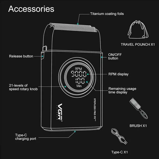 Curved Sharp Double Knife: VGR 377 Foil Shaver adopts curved precision steel blades, quickly cutting off long and short beards. The curved mesh provides protection for the skin and minimizes irritation to the greatest extent possible, so it can capture more short and thick beard, easily trim the hair of the face, neck, jaw or even bald head without pulling. Bringing you a comfortable and precision close shaving experience every time