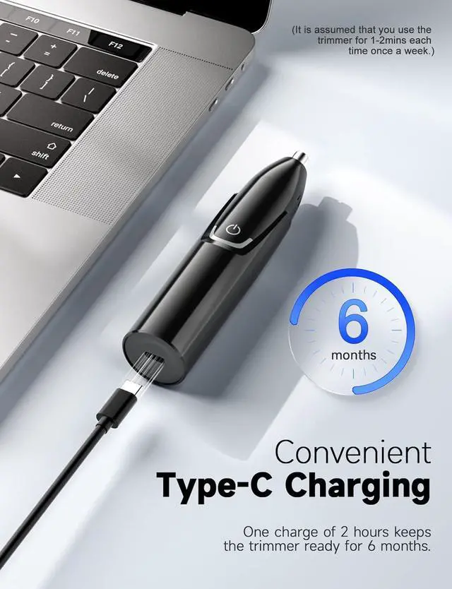 Rechargeable Battery & Long Standby Time Charge the nose hair trimmer using the included USB C charging cable. Charge on the go, connecting the cable to a USB port, power bank, computer, or USB car charger. One charge powers the nose hair trimmer for up to 6 months. The noise level during operation is about 50dB to reduce the disturbance.