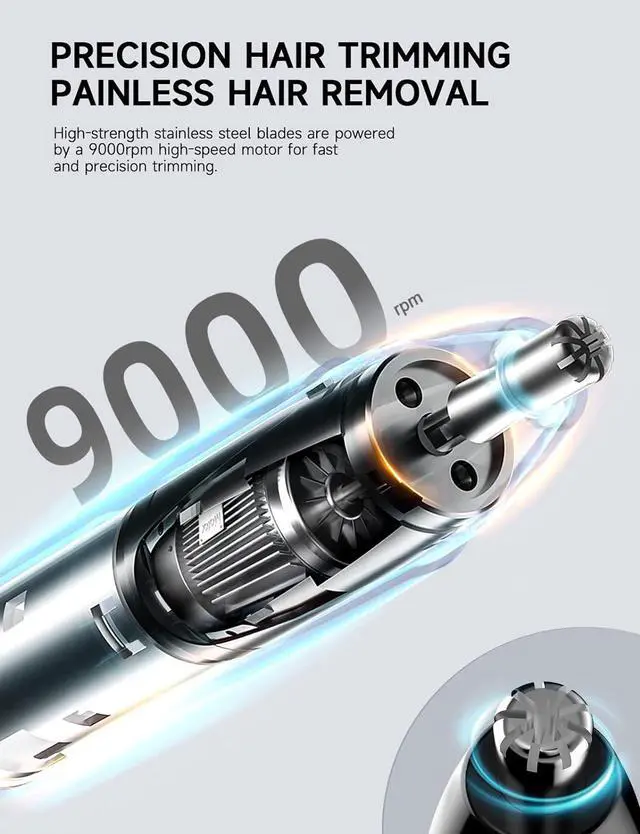 High Work Efficiency, High Level of Safety Powered by a 9000RPM high-speed motor, the dual-edge spinning blades quickly and precisely capture the long nose hairs, trim them to a proper length, and finish the trimming work for many strands once to save time. Lower the power level stably when the battery gets low to avoid painful pulling.