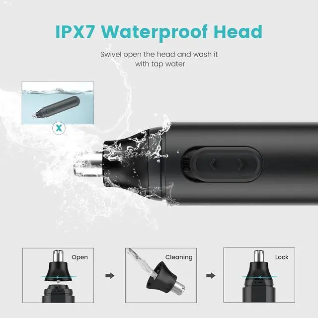 PAINLESS & SAFETY & EASY CLEANSINGWaterproof and washable, easily deal with residual by soak cleaning, even you take a shower. Washable and removable trimmer head is convenient for cleaning and maintenance. this nose hair trimmer for men cuts safely without any pain, this mens nose hair trimmer spares you from the risk of pulling your hair or damaging your skin.