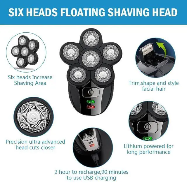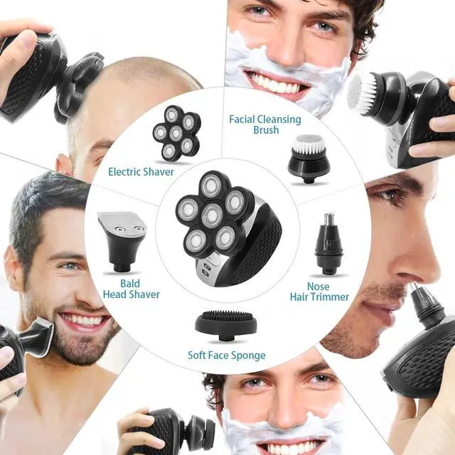Multifunctional electric head hair shaver are designed specifically for men and include a 4D razor, nose hair trimmer, hair clipper, facial cleaning brush and facial silicone brush and 3 limit combs of different sizes (3mm / 5mm / 7mm).