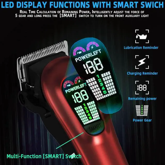 - Professional Hair Clippers&LED Display TCMKY Professional Hair Clippers for men which can display the remaining power,charging reminder indicator and Blade lubrication reminder indicator. Our ultra-high definition LED display provides you with all information to ensure that you use it correctly. In addition, it includes a full size guide comb to meet your need for trimmer your head and face. Due to its low noise and safety blade it is also suitable for children or young children to have a haircut