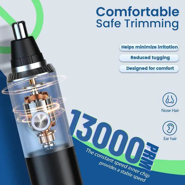 Yes! This trimmer uses a dual-edge spinning blade system with a 360° rotating design and protective cover. It cuts hair quickly and cleanly without tugging or discomfort, even in sensitive areas like the nostrils.