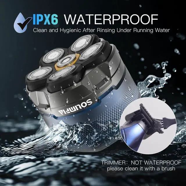 IPX6 Waterproof Wet & Dry Head Shaver: The whole body of SOLIMPIA electric head shaver is IPX6 waterproof, safe to use in the shower under running water, offering you a comfortable dry shave or a refreshing wet shave with shaving foam. The removable and washable head allows you to clean directly under the tap.
