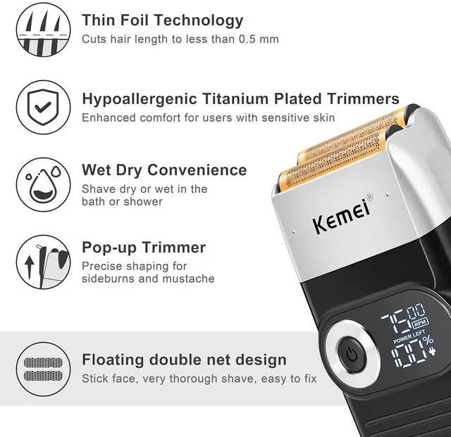 A PERFECT SHAVER: Kemei 2026 is a foil Professional electric shaver with a LED display makes the power and speed clearly visible, equipped with powerful motor and three speed adjustable. USB cable allows you to use it cordless or corded. A shaver great for bald and stubble and a trimmer best for fade work together can avoid too close shaving or not enough. Shaving, haircut, repair, multi-purpose shaver can be shared by the whole family